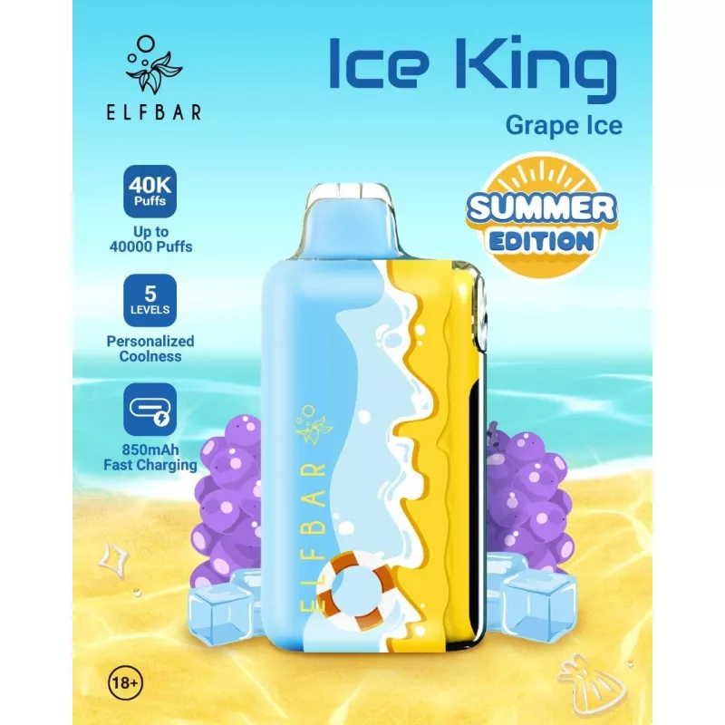 ELFBAR ICE KING Summer Edition Grape Ice подойдёт любителям классических фруктовых вкусов с выраженным эффектом «айс» и длительным ощущением прохлады.